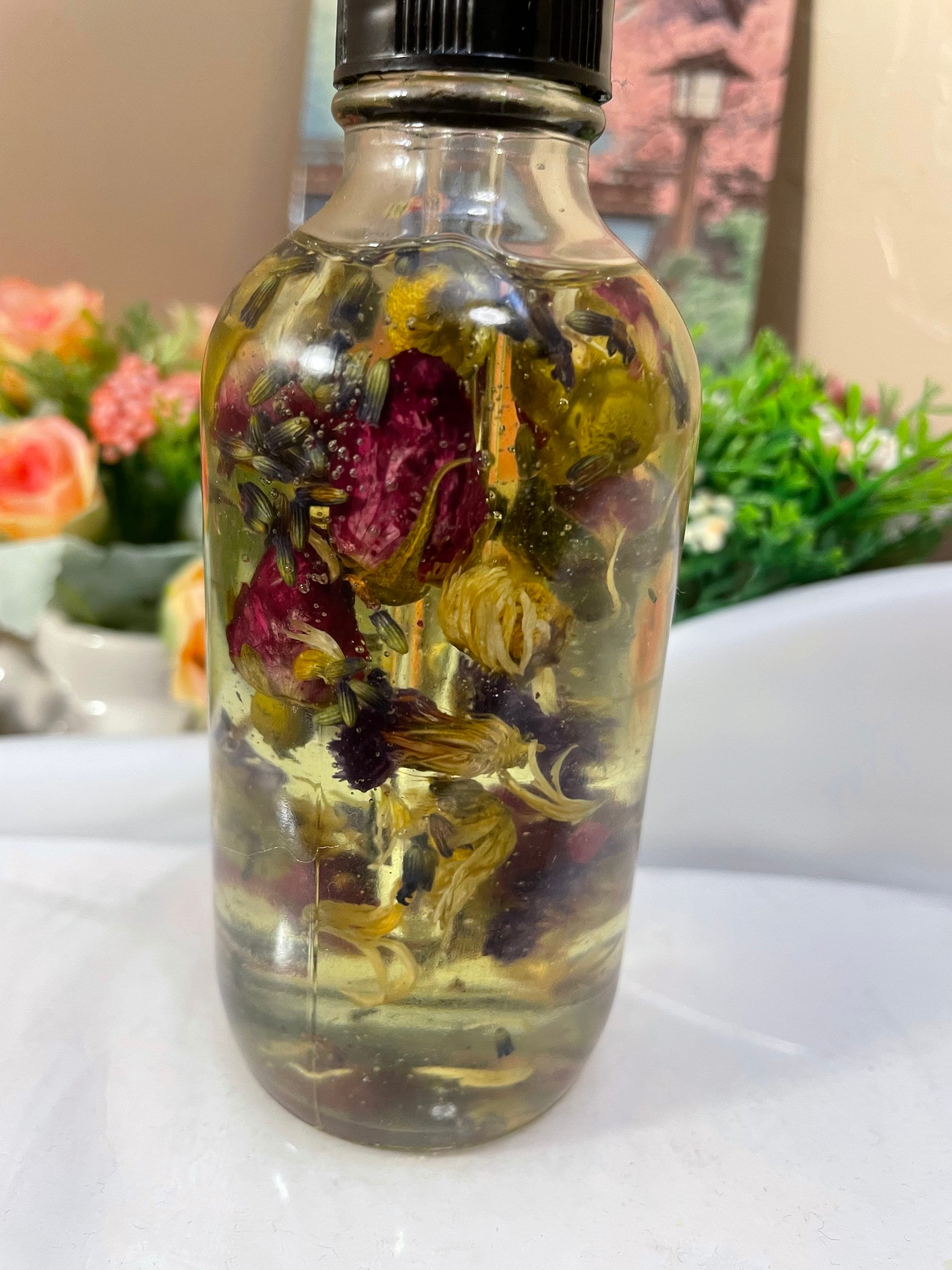 Ingredients: Rose Water Cucumber Oil Almond Oil Olive Oil Coconut Oil Tea Tree Extract Essential Oil Organic Dried Flower Buds Vitamin E rich in Linoleic Acid